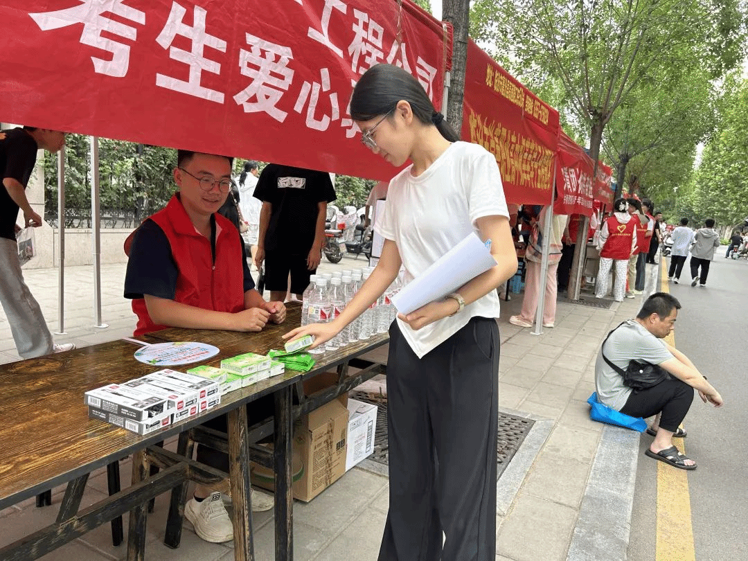 在育英中學(xué)等考點(diǎn)外,機(jī)械化集團(tuán)的“志愿紅”格外醒目。志愿者們搭建的遮陽(yáng)棚下,桌椅整齊排列,礦泉水、文具、防暑藥品等物資一應(yīng)俱全。他們還精心準(zhǔn)備了手寫祝福卡片,“愿你筆下生花,金榜題名!”等真摯話語(yǔ)傳遞著對(duì)考生的美好祝愿。