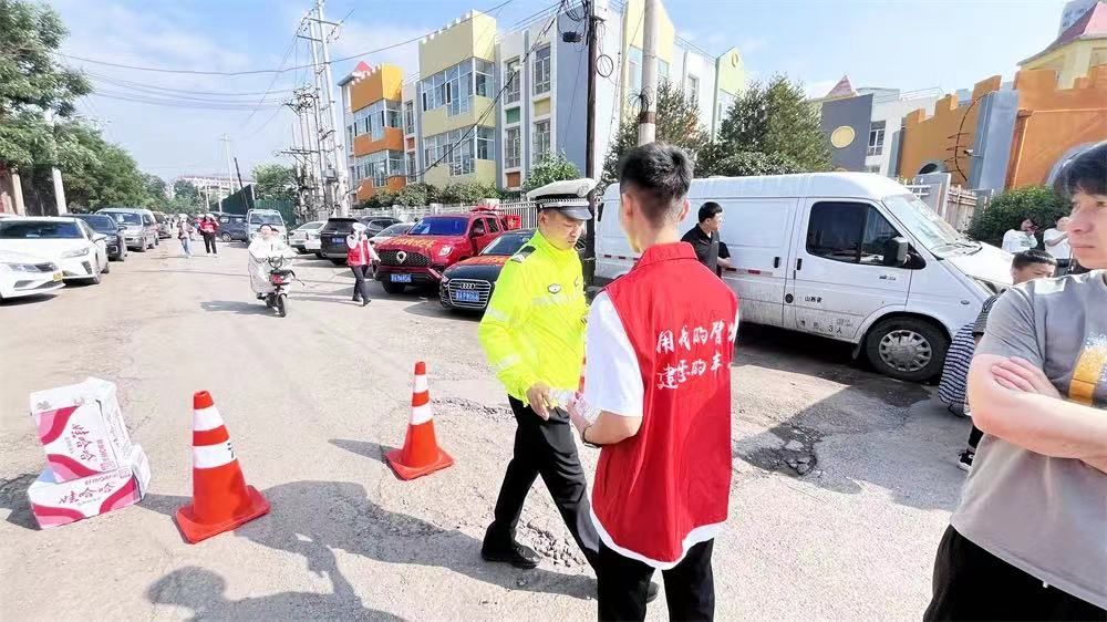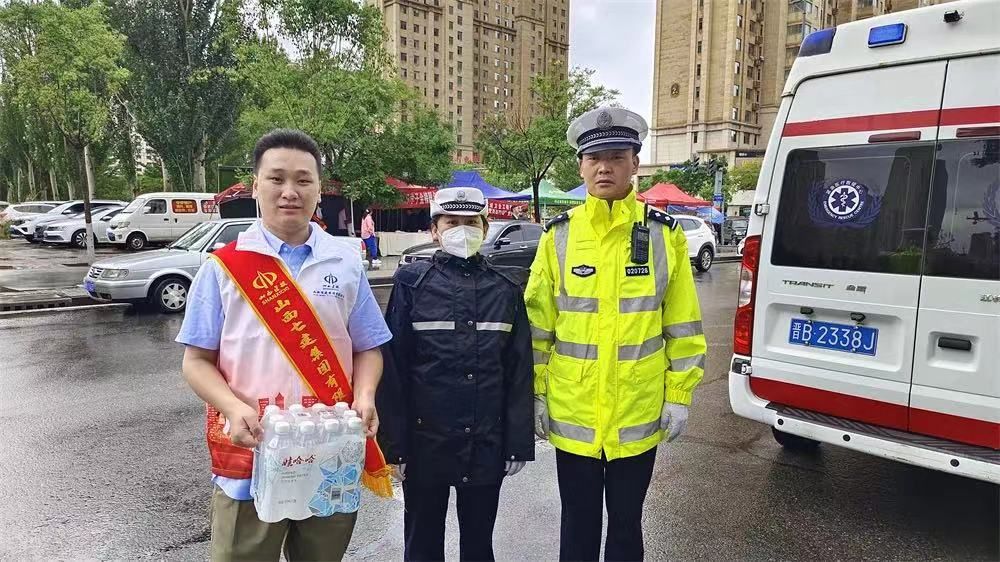 為守護(hù)在考場(chǎng)外的公安、交警等工作人員送上飲水,并全力協(xié)助交警在街頭巷尾維持交通秩序,確??忌軌虬踩?、快捷、順利抵達(dá)考場(chǎng)。