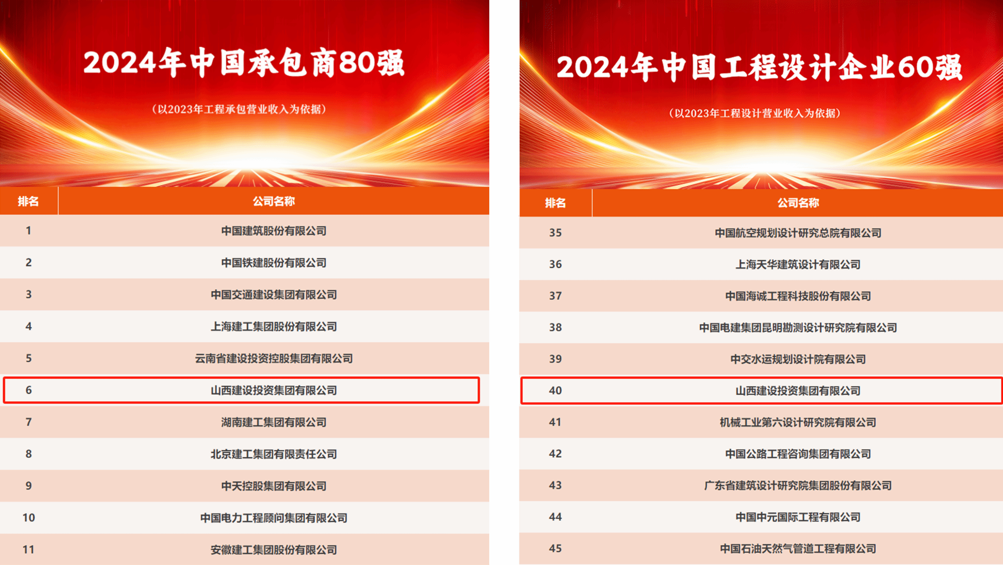 12月9日,美國《工程新聞記錄》(ENR)和中國《建筑時報》共同發(fā)布了2024年度中國承包商80強和工程設計企業(yè)60強榜單,山西建投集團位列中國承包商80強第6名,較2023年上升1位;工程設計企業(yè)60強第40名。