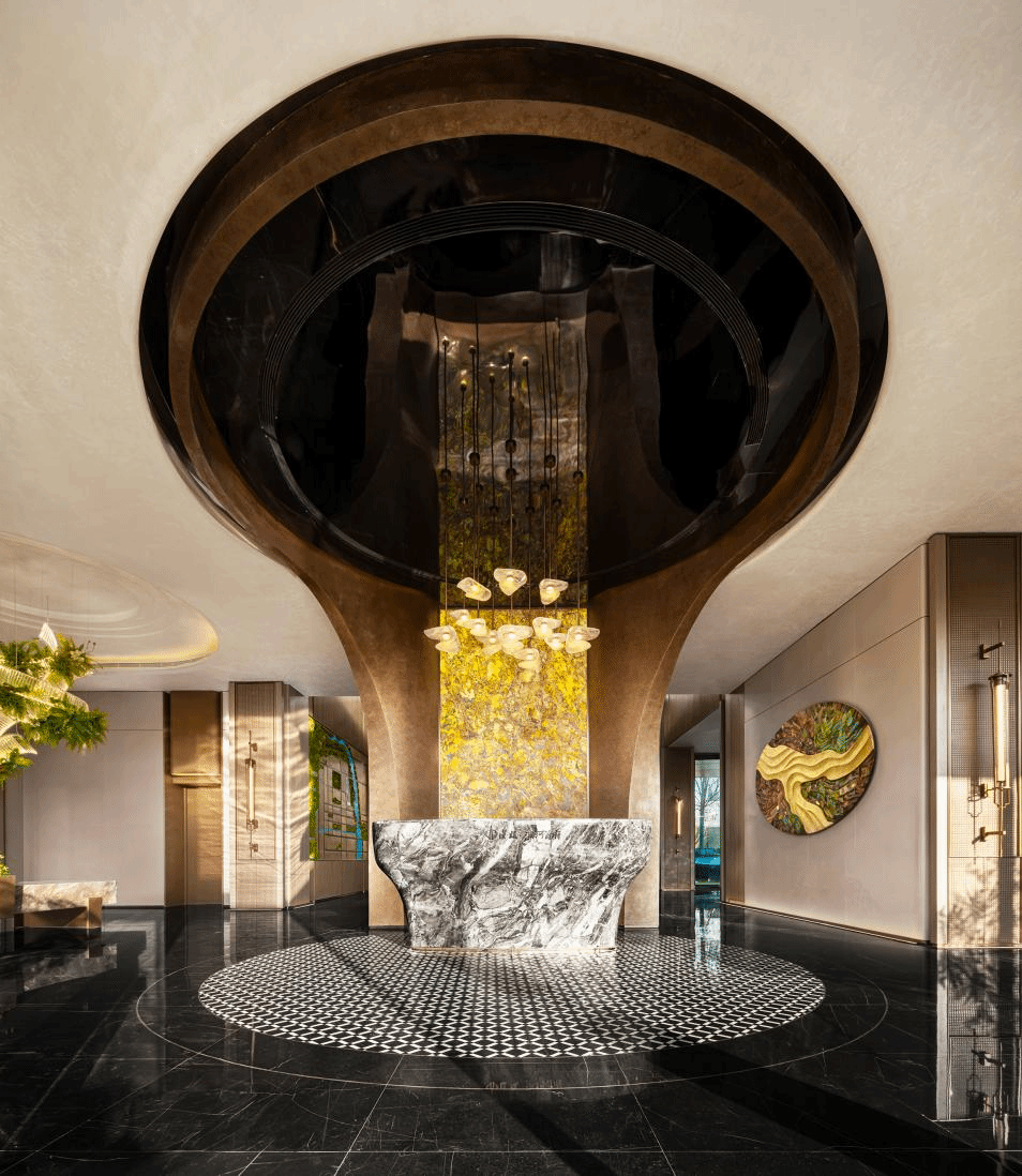 觀瀑|接待區(qū)扇形的架構與漸變色調(diào)讓人仿佛聆聽到水流撞擊巖石的聲音,大理石接待臺如山脈般堅實且充滿韻律,主視墻流暢的紋理與縱深的層次感,宛如山水的波瀾。