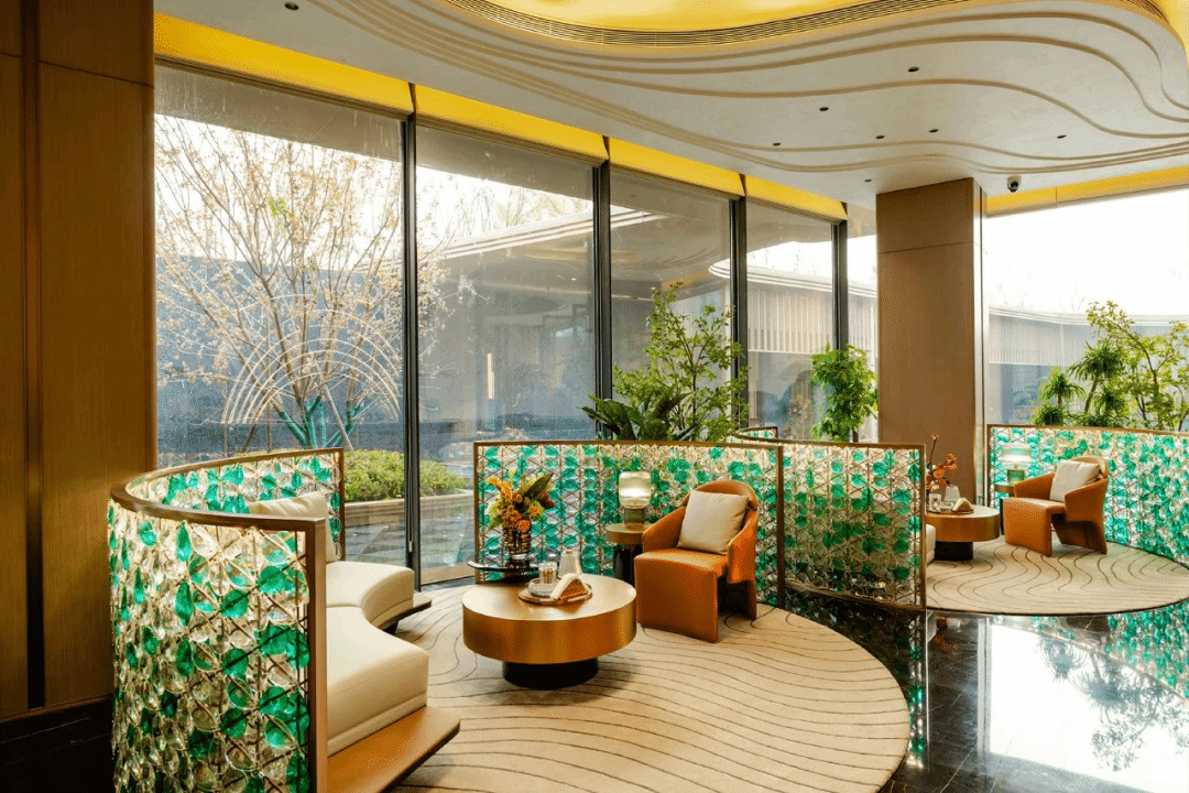 行舟|洽談區(qū)以汾河為背景,以船為引,強調(diào)流動感與優(yōu)雅;天花板的曲線造型如水波蕩漾,與地面柔和的波紋地毯形成呼應,整體造型自然流暢。