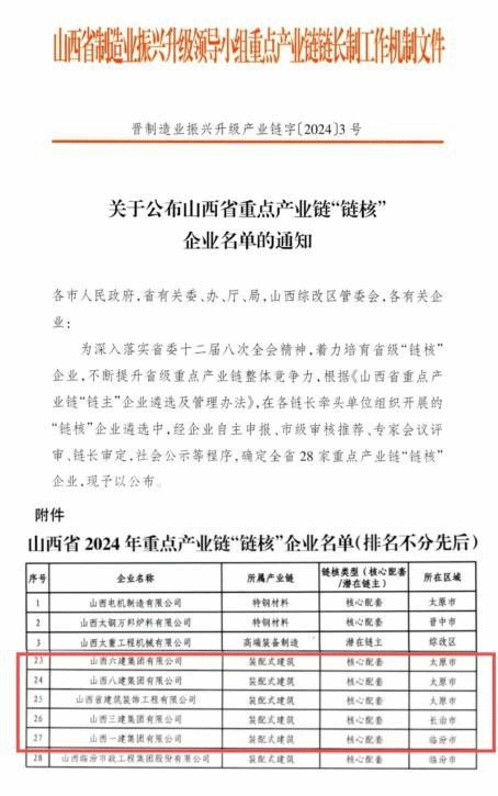 作為山西省裝配式建筑產(chǎn)業(yè)鏈“鏈主企業(yè)”,2024年,建投集團積極貫徹落實省委、省政府關(guān)于重點產(chǎn)業(yè)鏈“鏈長制”決策部署,充分發(fā)揮“鏈主”企業(yè)引領帶動作用,協(xié)同省住建廳、綜改示范區(qū)大力推行“政府+鏈主+園區(qū)”招商模式,積極協(xié)助開展招商引資工作。通過組織調(diào)研座談、供需對接、發(fā)展論壇等活動,推動裝配式建筑產(chǎn)業(yè)鏈取得顯著發(fā)展,新增6戶“鏈核”企業(yè)和8戶鏈上企業(yè),其中13戶為建投集團所屬企業(yè),業(yè)務涵蓋產(chǎn)業(yè)鏈上中下游各個環(huán)節(jié),實現(xiàn)產(chǎn)業(yè)鏈規(guī)模持續(xù)壯大。