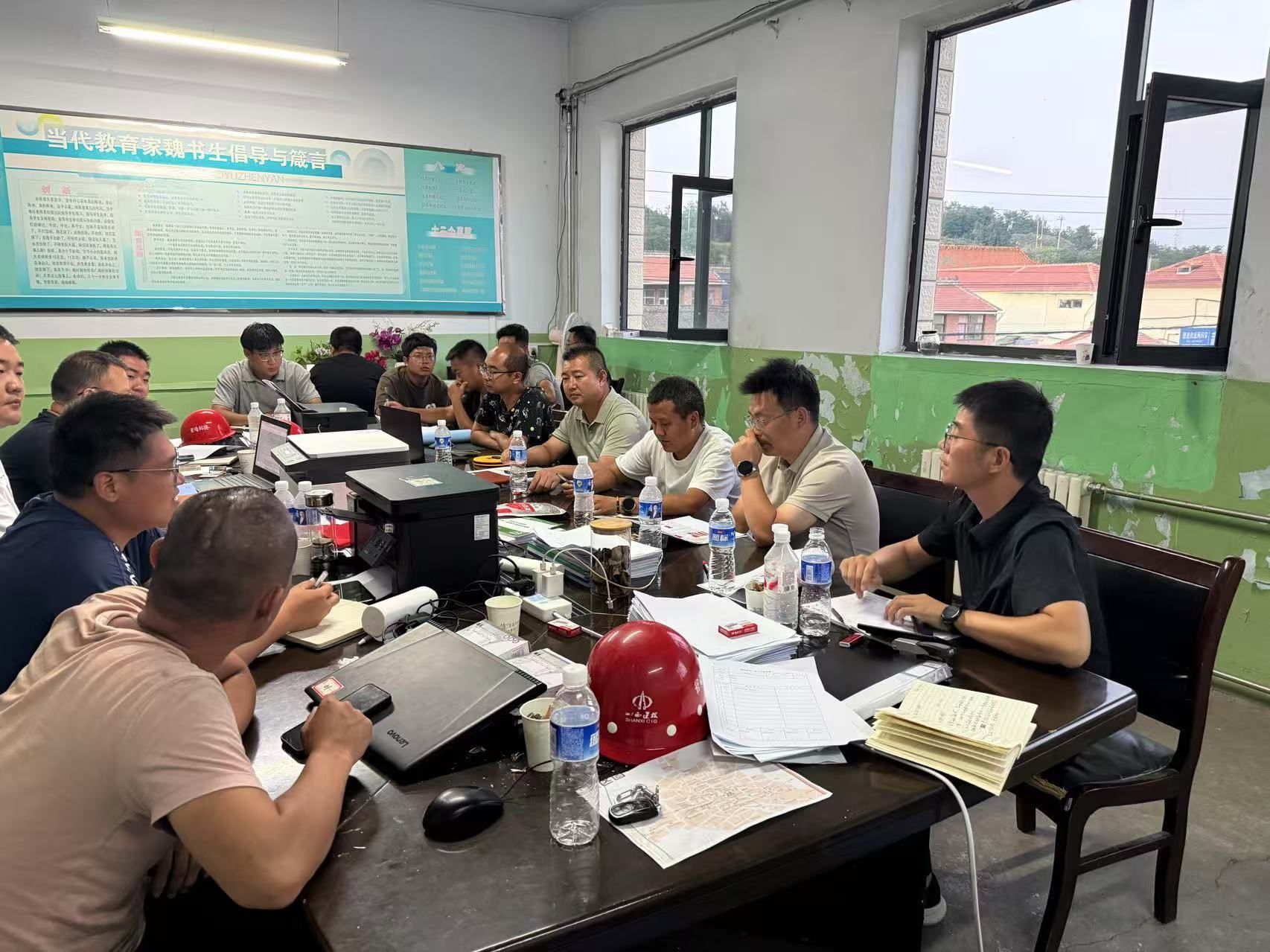 該工程分布范圍廣且分散,最遠的一所學(xué)校距離項目部有52.3公里;校舍結(jié)構(gòu)多樣、建設(shè)年代久遠,項目團隊面臨管理半徑長且復(fù)雜的難題。對此,團隊實施“網(wǎng)格管理、穿透對接”機制,組建了26人專項工作組,按鄉(xiāng)鎮(zhèn)和學(xué)校劃分責任網(wǎng)格,每個網(wǎng)格配備技術(shù)負責人和協(xié)調(diào)員,實現(xiàn)“一校一策”精準管理。同時,建立“日報告、周調(diào)度、月總結(jié)”的溝通機制,團隊成員駐場辦公,通過現(xiàn)場踏勘、圖紙會審、需求調(diào)研等方式,與校方、建設(shè)方開展穿透式對接,累計解決各類問題百余項。