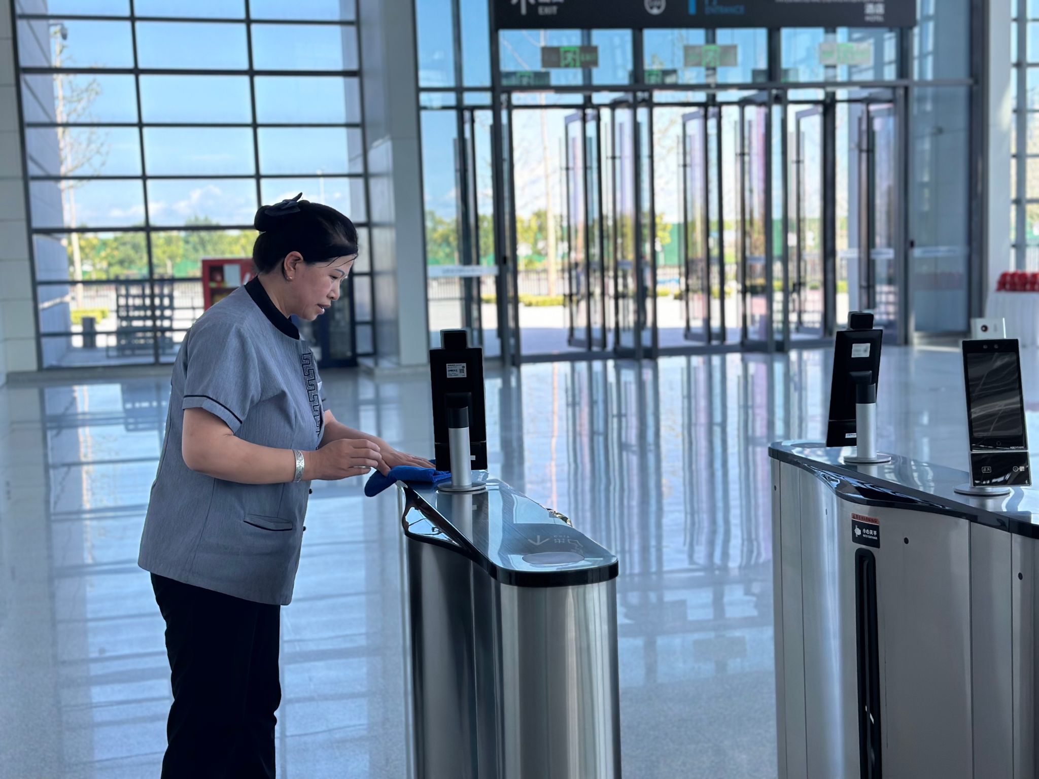 保潔團(tuán)隊(duì)提前10天對(duì)主會(huì)場(chǎng)、門廊、車庫雨棚開展高空清洗,完成樓內(nèi)綠植租擺及養(yǎng)護(hù);對(duì)玻璃幕墻、石材墻面、外圍地面、電梯、消防通道等開展集中精細(xì)化保潔,并于會(huì)前增加消殺頻次,為大會(huì)提供安全舒適的場(chǎng)館環(huán)境;展會(huì)期間,實(shí)施分區(qū)域、分時(shí)段清潔制度,對(duì)重點(diǎn)區(qū)域高頻次清掃,并分類處理特殊垃圾,保持展館環(huán)境整潔有序。