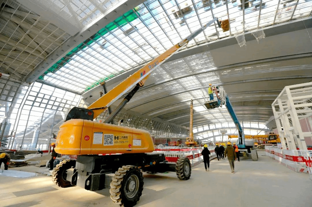 在實(shí)施雨棚燈安裝任務(wù)時(shí),集團(tuán)又遇到了新的困難和挑戰(zhàn)。雨棚屋面采用圓弧異型設(shè)計(jì),站臺(tái)禁止大型機(jī)械設(shè)備進(jìn)入,但普通設(shè)備根本無法完成50米高的作業(yè)任務(wù)。項(xiàng)目團(tuán)隊(duì)急中生智,想出妙招——緊急調(diào)來100臺(tái)舉臂車,這些“鋼鐵螳螂”揮舞長臂,將作業(yè)人員舉升到空中進(jìn)行作業(yè)。最終,完成了12000盞燈的安裝。