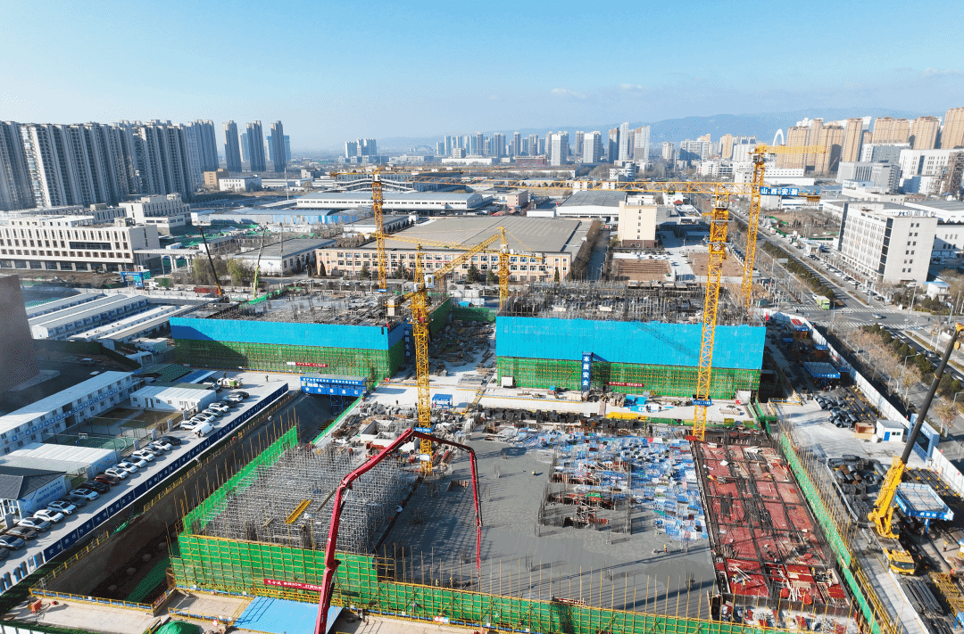 項目面臨結(jié)構(gòu)復(fù)雜、工期緊張、單位含鋼量達普通建筑三倍等多重挑戰(zhàn)。為此,團隊將精細化理念貫穿技術(shù)攻堅全程,以技術(shù)預(yù)控和方案創(chuàng)新推動資源優(yōu)化與效率提升。例如,在塔吊布置環(huán)節(jié),經(jīng)反復(fù)模擬驗證,將塔吊數(shù)量由3臺增至5臺,并創(chuàng)新采用“承臺基礎(chǔ)+承臺梁+防水板”與塔吊基礎(chǔ)一體化承載體系,既減少獨立基礎(chǔ)施工量,也顯著提升吊裝效率。面對高水位、高靈敏性土質(zhì),團隊運用中心島開挖法,實施分階段開挖與同步支護,結(jié)合出土量動態(tài)監(jiān)控,僅用35天完成25萬方土方外運,為后續(xù)施工爭取主動。主體結(jié)構(gòu)施工中,團隊進一步采用“施工段劃分+流水作業(yè)”模式,借助每日生產(chǎn)例會精準(zhǔn)協(xié)調(diào)工序銜接,確保各環(huán)節(jié)有序推進。這一系列精細舉措,最終成就了“35天完成正負零、60天實現(xiàn)主體封頂”的安裝速度。