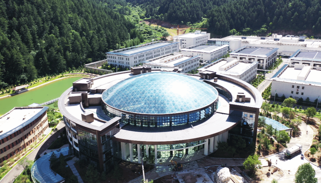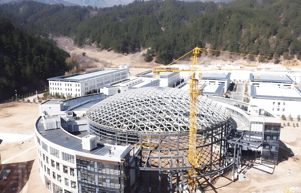 針對現(xiàn)場安裝條件,團(tuán)隊(duì)創(chuàng)新采用頂升方案將網(wǎng)架頂至屋面標(biāo)高,該工藝在鋁合金單殼結(jié)構(gòu)中屬國內(nèi)首次應(yīng)用。相關(guān)成果《大跨度鋁合金球面網(wǎng)殼精益制造及頂升安裝關(guān)鍵技術(shù)研究》榮獲華夏建設(shè)科學(xué)技術(shù)獎,經(jīng)山西省鋼結(jié)構(gòu)協(xié)會鑒定,“成果整體達(dá)到國際先進(jìn)水平,鋁合金單層球殼頂升安裝技術(shù)達(dá)到國際領(lǐng)先水平?!边@頂閃耀山林的精品穹頂,不僅是建筑美學(xué)的呈現(xiàn),更彰顯了集團(tuán)以技術(shù)創(chuàng)新“開創(chuàng)未來”的底氣。