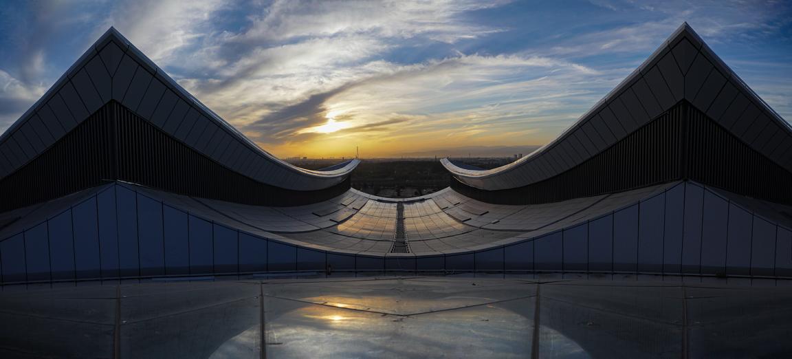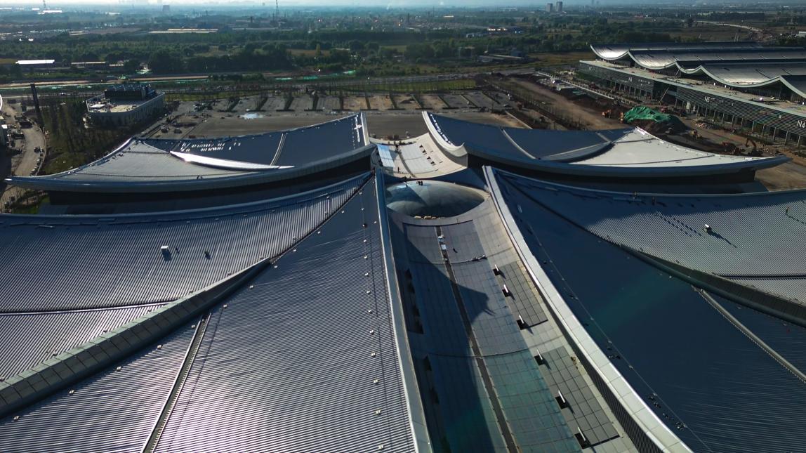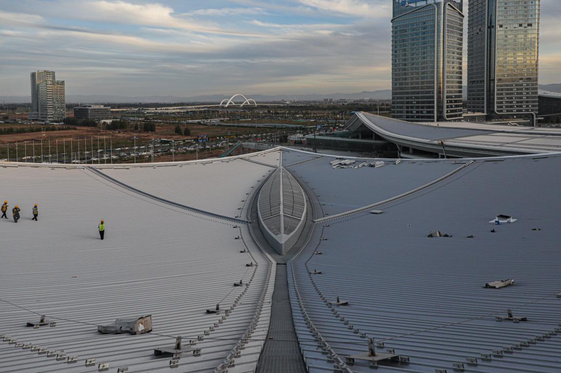 項(xiàng)目屋頂在設(shè)計(jì)階段通過防墜落系統(tǒng)、融雪系統(tǒng)、虹吸雨排系統(tǒng)解決了屋面面積大、檢修及排水困難等問題。項(xiàng)目技術(shù)班組通過建立BIM模型進(jìn)行節(jié)點(diǎn)優(yōu)化、指導(dǎo)加工下料,以技術(shù)保障實(shí)現(xiàn)預(yù)期效果。施工階段采用了雙曲面鍍鋁鋅鋼板金屬屋面(不滑移)系統(tǒng)、直立鎖邊技術(shù),有效提高了金屬屋面整體性能,增強(qiáng)了屋面防水和抗風(fēng)揭能力。十字交通廳及中心穹頂采用三維模擬分割、雙曲夾膠玻璃加工、旋轉(zhuǎn)桁架高空吊裝、接縫防水等針對(duì)性技術(shù)和工藝措施,高質(zhì)高效完成了異形雙曲面單元玻璃板塊的定制安裝,從物理和心理雙重層面實(shí)現(xiàn)了“凝心聚力”的設(shè)計(jì)理念。