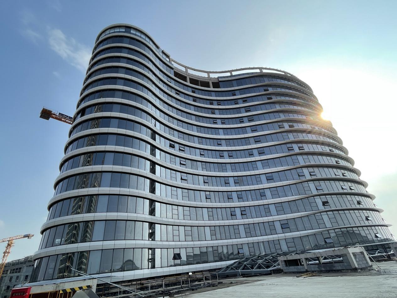 2號(hào)酒店項(xiàng)目100多米的高空上,技術(shù)嫻熟的幕墻安裝工人們穿梭在鋼板之間,正在安裝一塊塊約1噸重的玻璃幕墻。大型吊車(chē)忙碌地將屋頂所需材料精準(zhǔn)運(yùn)送到位。屋頂上,吊裝到位的鋼結(jié)構(gòu)網(wǎng)架在火花四濺的焊花中被焊牢、成型。建筑外立面上,“蜘蛛俠”一樣的工人師傅們系著安全帶,自上而下搭設(shè)著幕墻面層需要的“龍骨”。