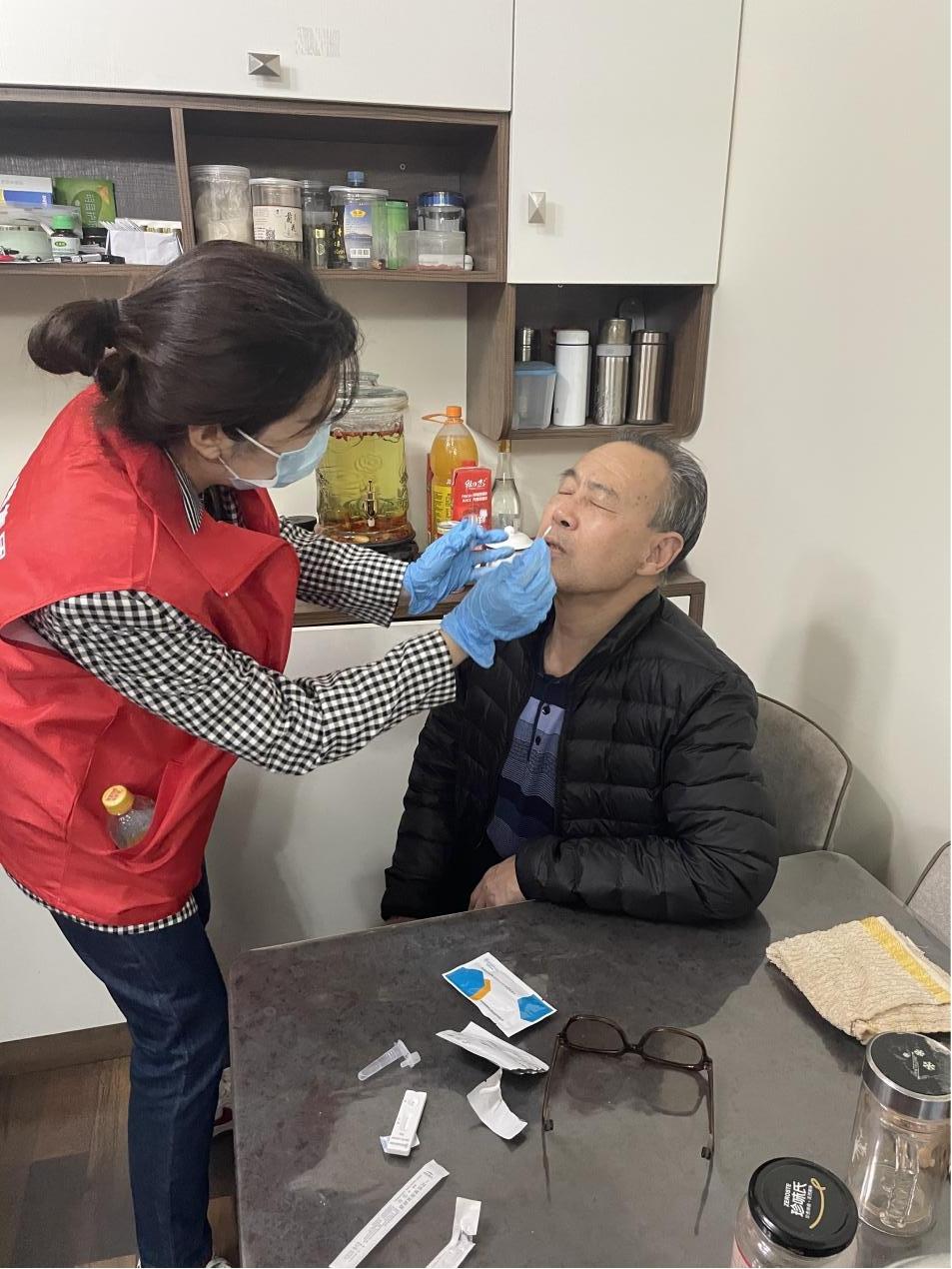(志愿者協(xié)助社區(qū)工作人員為居民發(fā)放自測新冠抗原試劑盒,幫助老人幼兒檢測,確保不漏一戶一人。)