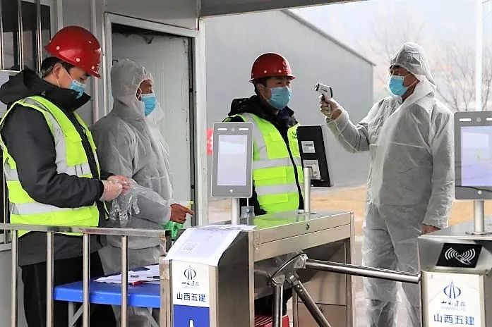 2020年初,面對突如其來的疫情,項目部一手抓防疫一手抓復產,制定《疫情防控工作方案》和《疫情防控應急預案》,成立疫情防控工作組。嚴格對進出場人員進行核查,團結全體員工,始終保持沖刺姿態(tài),全力奮戰(zhàn)在施工一線。