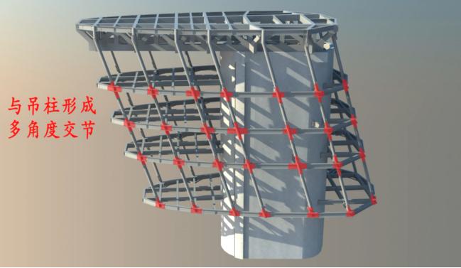 主要建筑終點(diǎn)塔采用鋼筋混凝土核心筒+異形懸掛鋼結(jié)構(gòu);媒體中心采用雙層懸挑鋼結(jié)構(gòu)設(shè)計(jì),懸挑長(zhǎng)度達(dá)建筑寬度的56%,兩座建筑間通過(guò)端部支座緊緊銜接。異形曲面懸掛式建筑底層架空,無(wú)支撐鋼柱,建筑外形為曲面、異形,整個(gè)結(jié)構(gòu)的荷載由屋面的曲面巨型桁架傾斜73°,外掛14根豎向吊桿承載下部樓層。施工時(shí)既要滿(mǎn)足工期要求,還需滿(mǎn)足異形曲面建筑各節(jié)點(diǎn)安裝精度要求,同時(shí)外立面采用全玻璃幕墻,應(yīng)二青會(huì)場(chǎng)館的驗(yàn)收要求,工期緊迫,幕墻構(gòu)件需提前制作,與鋼結(jié)構(gòu)安裝形成流水段,無(wú)后期調(diào)整的可能,這就使得整個(gè)懸掛式鋼結(jié)構(gòu)建筑施工難度增大。