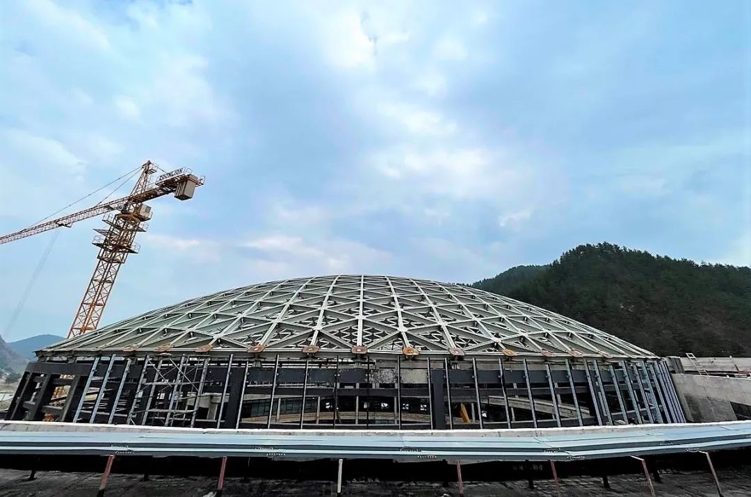 該工程位于交城縣龐泉溝風(fēng)景旅游區(qū)腳下,為山西省首個(gè)大跨度單層鋁合金板式節(jié)點(diǎn)網(wǎng)殼結(jié)構(gòu)。其三角形網(wǎng)格尺寸約2.5米*2.5米*2.5米,桿件采用6061-T6材質(zhì)鋁合金型材,截面為H300毫米*150毫米*8毫米*12毫米;節(jié)點(diǎn)盤(pán)采用6061-T6材質(zhì)鋁合金板材,板厚12毫米;節(jié)點(diǎn)采用304不銹鋼專(zhuān)用螺栓連接。網(wǎng)殼跨度58.3米,矢高9米,周邊多點(diǎn)支撐于鋼梁與混凝土梁頂,支座標(biāo)高18.3米。
