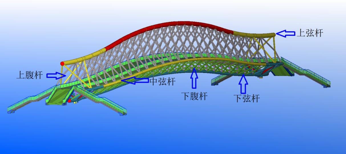 該項目采用簡支鋼桁梁結(jié)構(gòu),橋梁單跨達123米,為國內(nèi)景觀人行橋之最,實施難度大。整個橋梁線形采用弧形曲線設(shè)計,橋梁寬度、高度不斷變化,桿件繁多,現(xiàn)場高空焊接工作量大,多管相貫節(jié)點焊接工藝復雜,橋梁拼裝精度及焊接變形控制難度大。