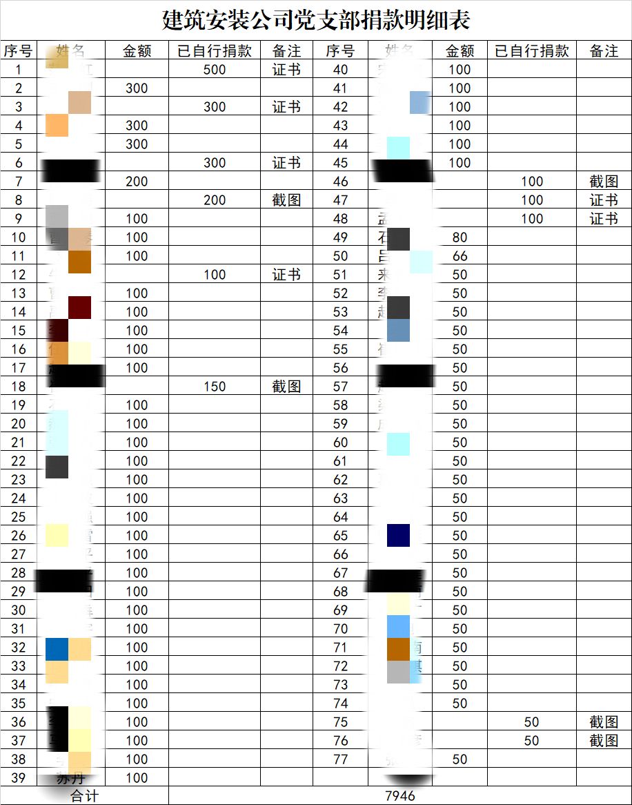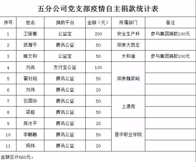 面對嚴峻的疫情防控形勢,公司黨委向全體建工人發(fā)出募捐倡議,五分公司上下積極響應捐款倡議,截止目前共計195人捐款,捐款金額15480元。此外,還有11名員工自主通過騰訊、支付寶等平臺捐款660元。