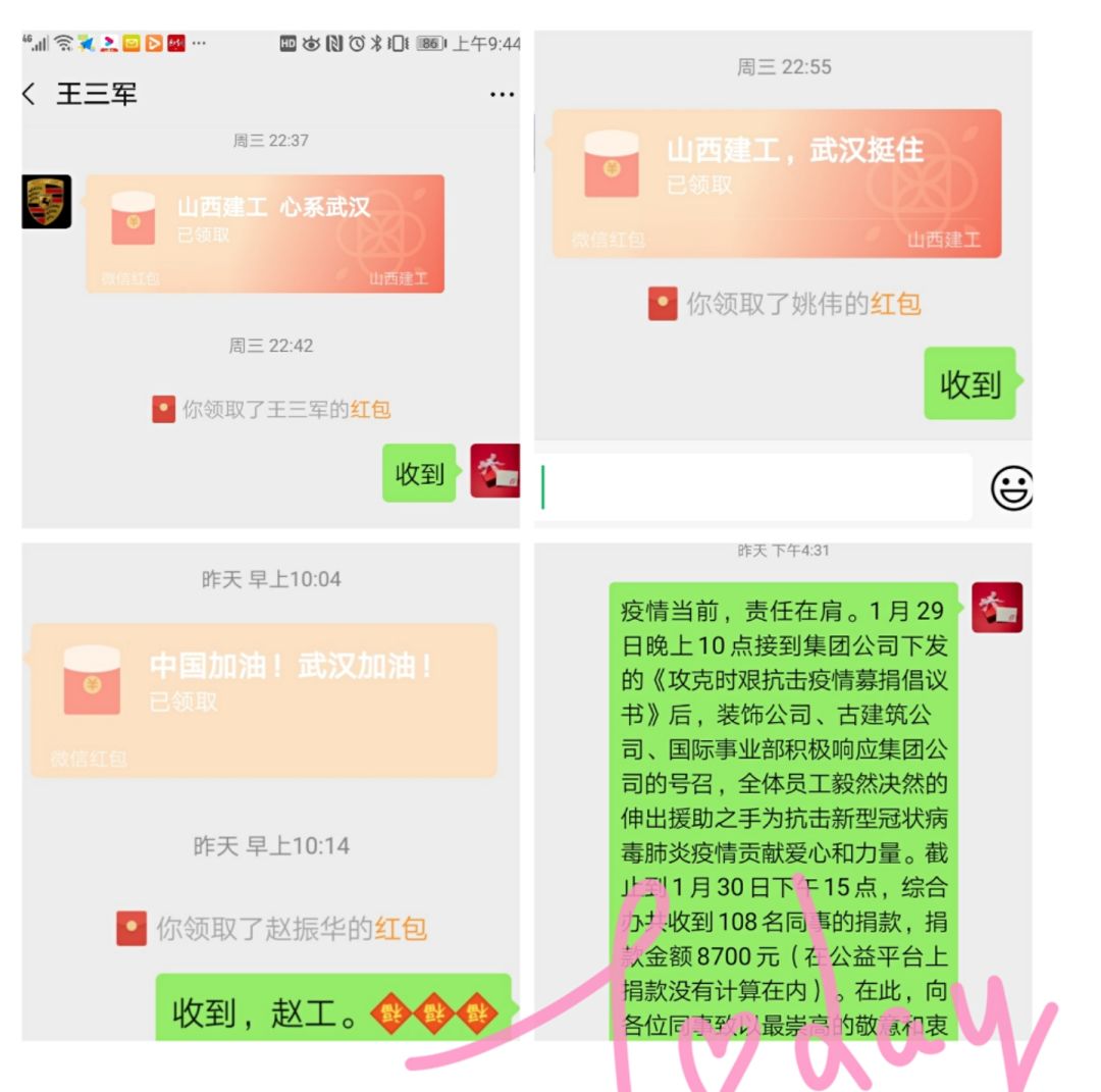 防疫攻堅戰(zhàn)進入關鍵時期,裝飾公司、古建筑公司、國際事業(yè)部號召全體員工愛心捐款,以實際行動為打贏疫情防控戰(zhàn)貢獻力量,全體員工積極響應號召,踴躍捐款,相信我們只要團結一致,聽從黨的指揮,一定能盡早打贏這場沒有硝煙的戰(zhàn)役,武漢加油!中國加油!