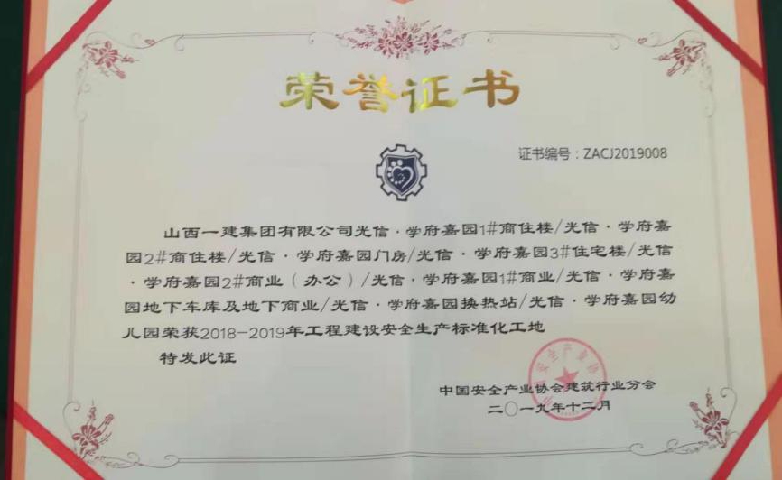 12月22日,中國(guó)安全生產(chǎn)協(xié)會(huì)建筑行業(yè)分會(huì)2019年年會(huì)在杭州舉行。會(huì)上,對(duì)2019年安全生產(chǎn)先進(jìn)單位進(jìn)行了表彰,公司承建的光信·學(xué)府嘉園項(xiàng)目榮獲“2018-2019年工程建設(shè)安全生產(chǎn)標(biāo)準(zhǔn)化工地”,第九分公司安全科李高平代表領(lǐng)獎(jiǎng)。