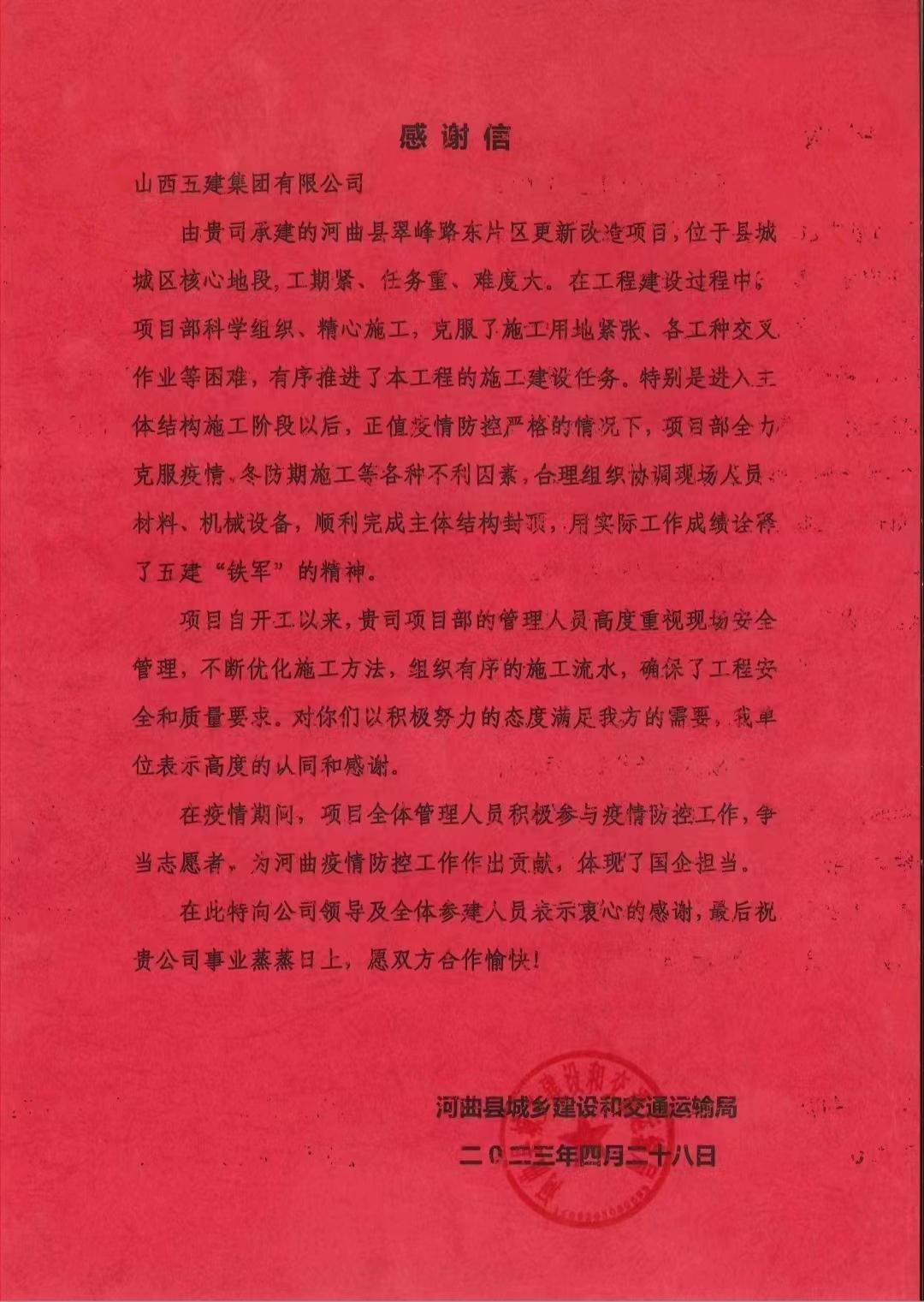 河曲縣翠峰路東片區(qū)更新改造項(xiàng)目收到來(lái)自河曲縣城鄉(xiāng)建設(shè)和交通運(yùn)輸局的感謝信