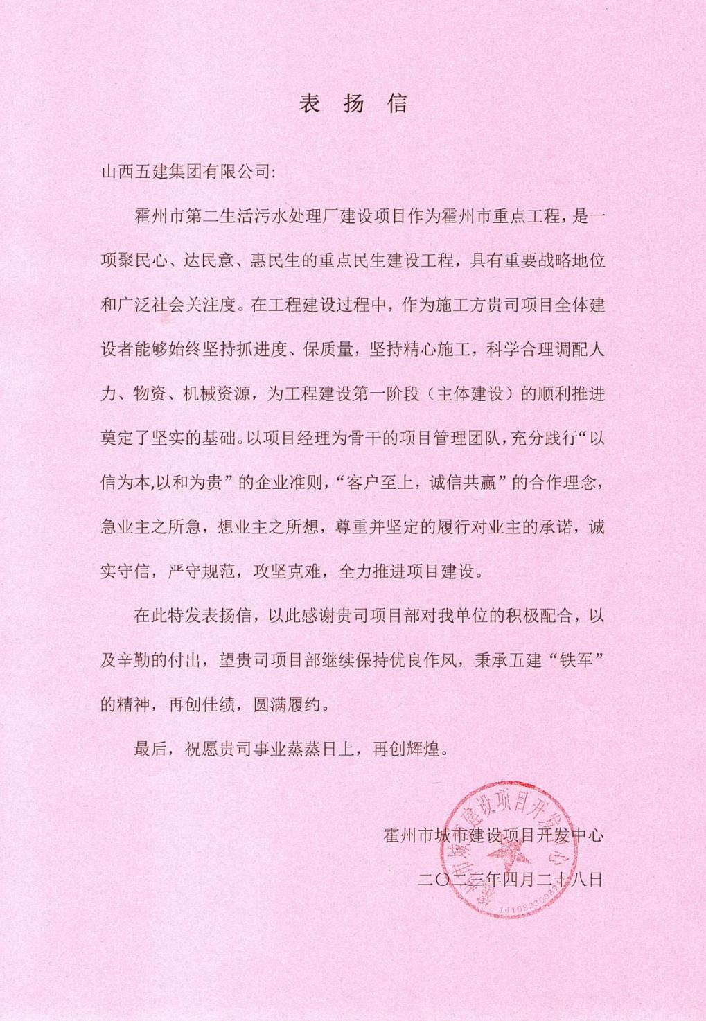 霍州市第二污水處理廠建設(shè)項(xiàng)目收到來(lái)自霍州市城市建設(shè)項(xiàng)目開(kāi)發(fā)中心的感謝信
