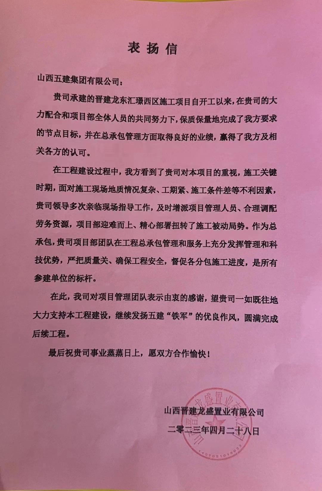 晉建·龍東匯璟(一期)西區(qū)施工項(xiàng)目收到來(lái)自山西晉建龍盛置業(yè)有限公司感謝信