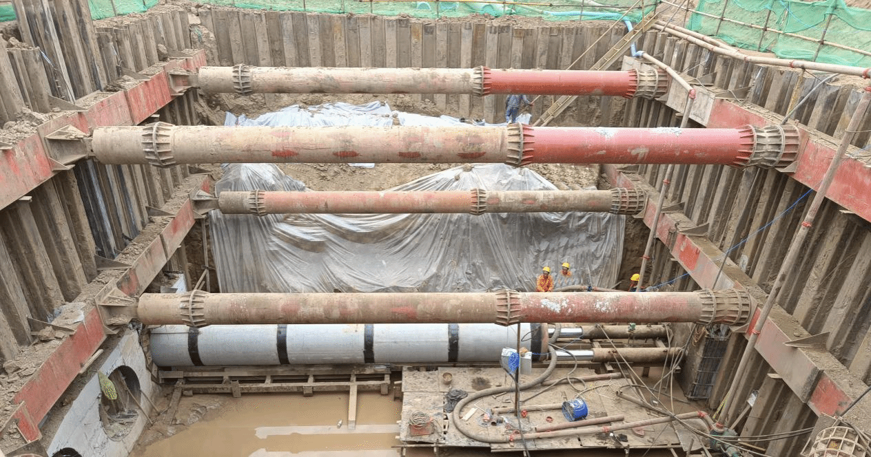 頂管單管長110米,基坑深度11.4米,管間距1.2米,頂管過程中相鄰管道之間土層擾動影響較大,精度要求高。項目綜合運用了紅外線定位技術(shù)、經(jīng)緯儀、全站儀和RTK定位儀等高精度測量工具,進行實時輔助測量,確保頂管方向精準無誤。每向前頂進10米,即實施一次全面而細致的測量復核,確保施工精度。同時,對頂管機進行優(yōu)化改造,在機頭部位焊接高效破刀裝置,通過松動機頭前方的土層,有效減小頂進過程中的阻力與壓力,促進泥漿順利形成,顯著提升頂管作業(yè)效率。