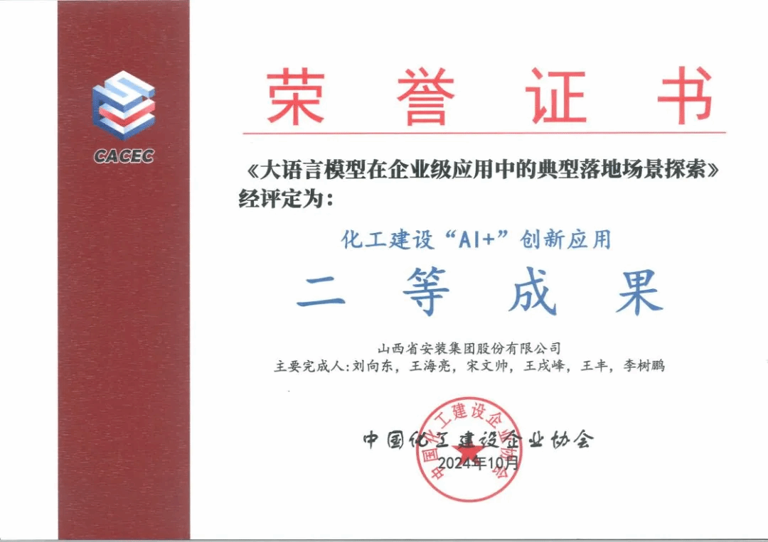 10月,中國化工建設(shè)企業(yè)協(xié)會發(fā)布了第一批化工建設(shè)“AI+”應(yīng)用成果,其中,安裝集團(tuán)《大語言模型在企業(yè)級應(yīng)用中的典型落地場景探索》獲二等創(chuàng)新應(yīng)用成果。