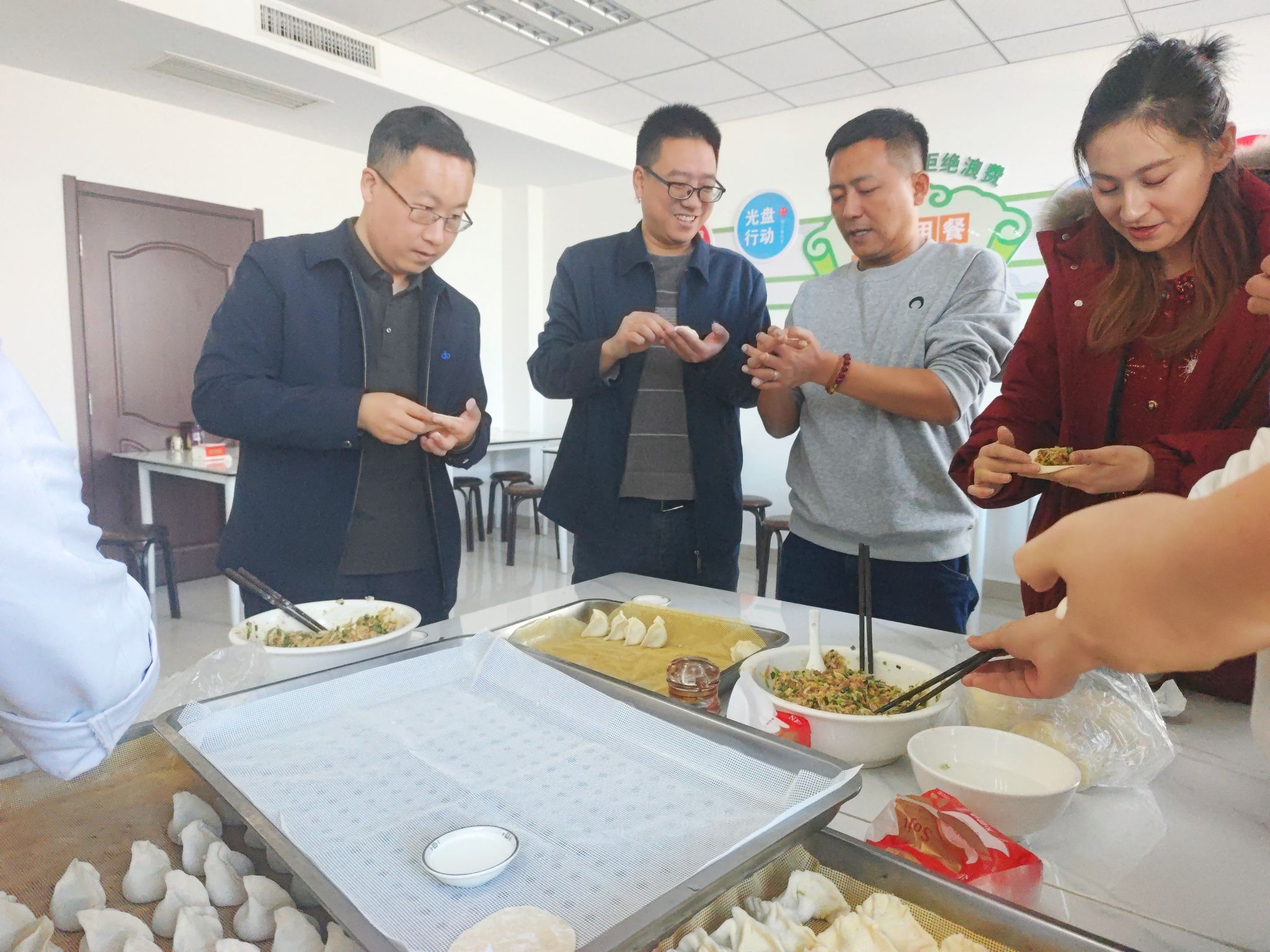 包餃子現(xiàn)場(chǎng),大家全心投入,各顯其能,配合默契,個(gè)個(gè)都變成“包餃子能手”,一合一捏之間,各式各樣的餃子就成型了:有精致小巧的“柳葉”餃、有個(gè)大飽滿的“包子”餃、有大圓肚的“元寶”餃,還有太陽(yáng)般的“鼓”餃.......每個(gè)人的臉上都洋溢著燦爛的笑容,大家分工合作,互幫互教,一排排獨(dú)具個(gè)性的餃子很快就擺滿了一個(gè)個(gè)餐盤(pán)。每一個(gè)餃子都充滿了員工認(rèn)真、用心的態(tài)度,不同的餃子形象也寄托著公司和員工的共同希冀——愿公司發(fā)展蒸蒸日上,員工生活幸福美滿。