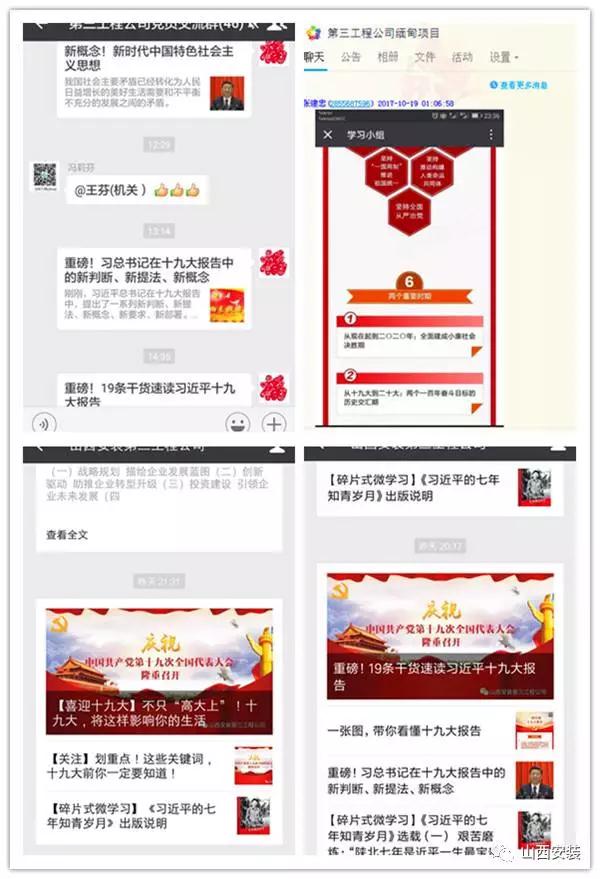 第三工程公司黨總支第一時(shí)間在自有微信公眾號(hào)、工作群等載體上宣傳學(xué)習(xí)黨的十九大精神。