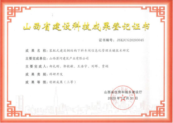 裝配式建筑鋼結(jié)構(gòu)下料車間信息化管理關(guān)鍵技術(shù)研究科技成果登記證書