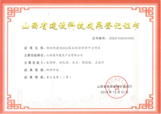 鋼結(jié)構(gòu)建筑BIM集成制造管理平臺(tái)研發(fā)成果登記證書